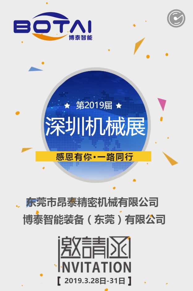 第20届深圳国际机械制造工业展览会 地址:中国.深圳会展中心 展位:8号馆 8C49 现诚邀阁下于2019年3月28日至31日莅临我司展台 参观感谢您的支持 710公海寰宇智能装备(东莞)有限公司